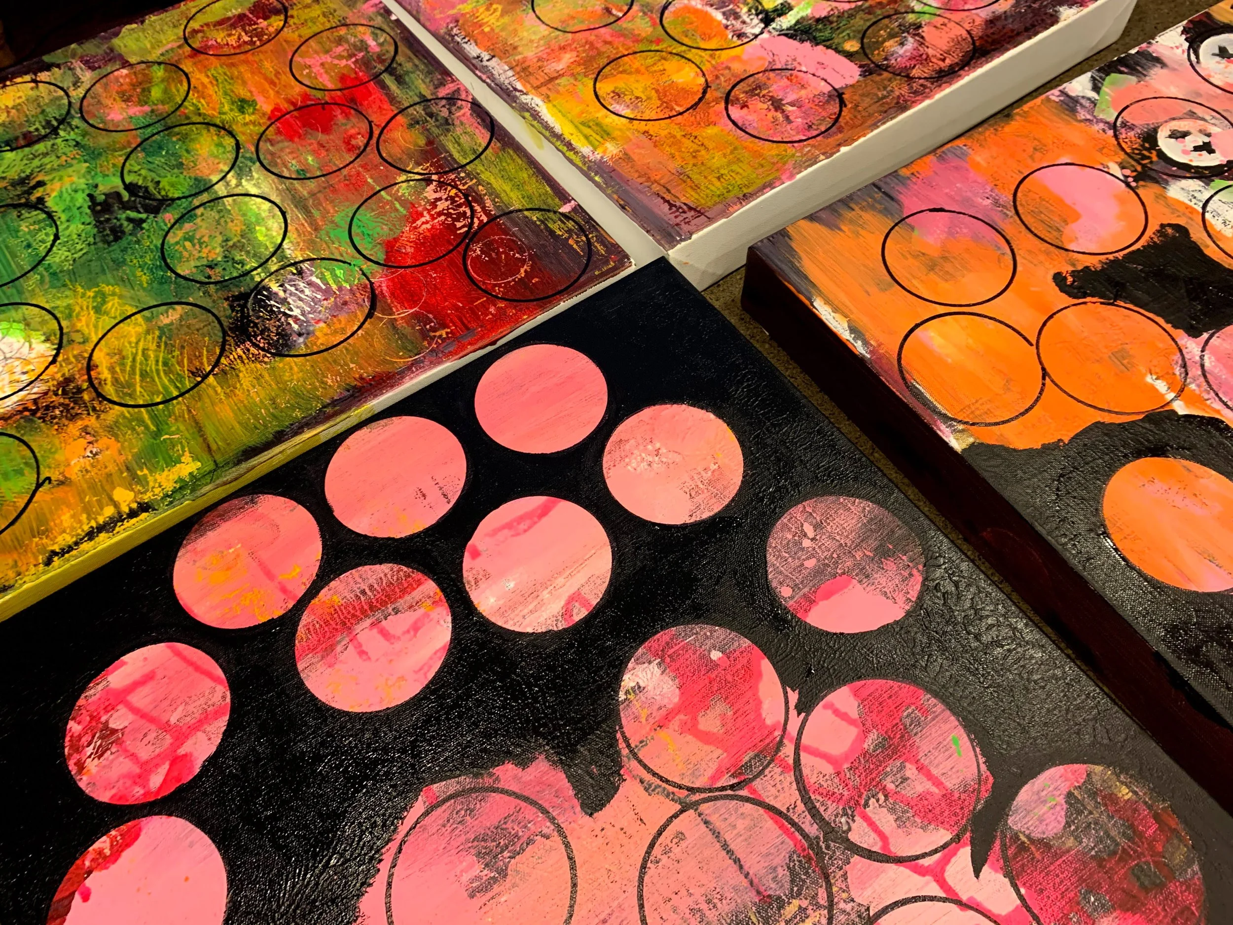 Close-up view of several abstract acrylic paintings on canvas featuring circles and vibrant colors like pink, orange, black, green, and red.