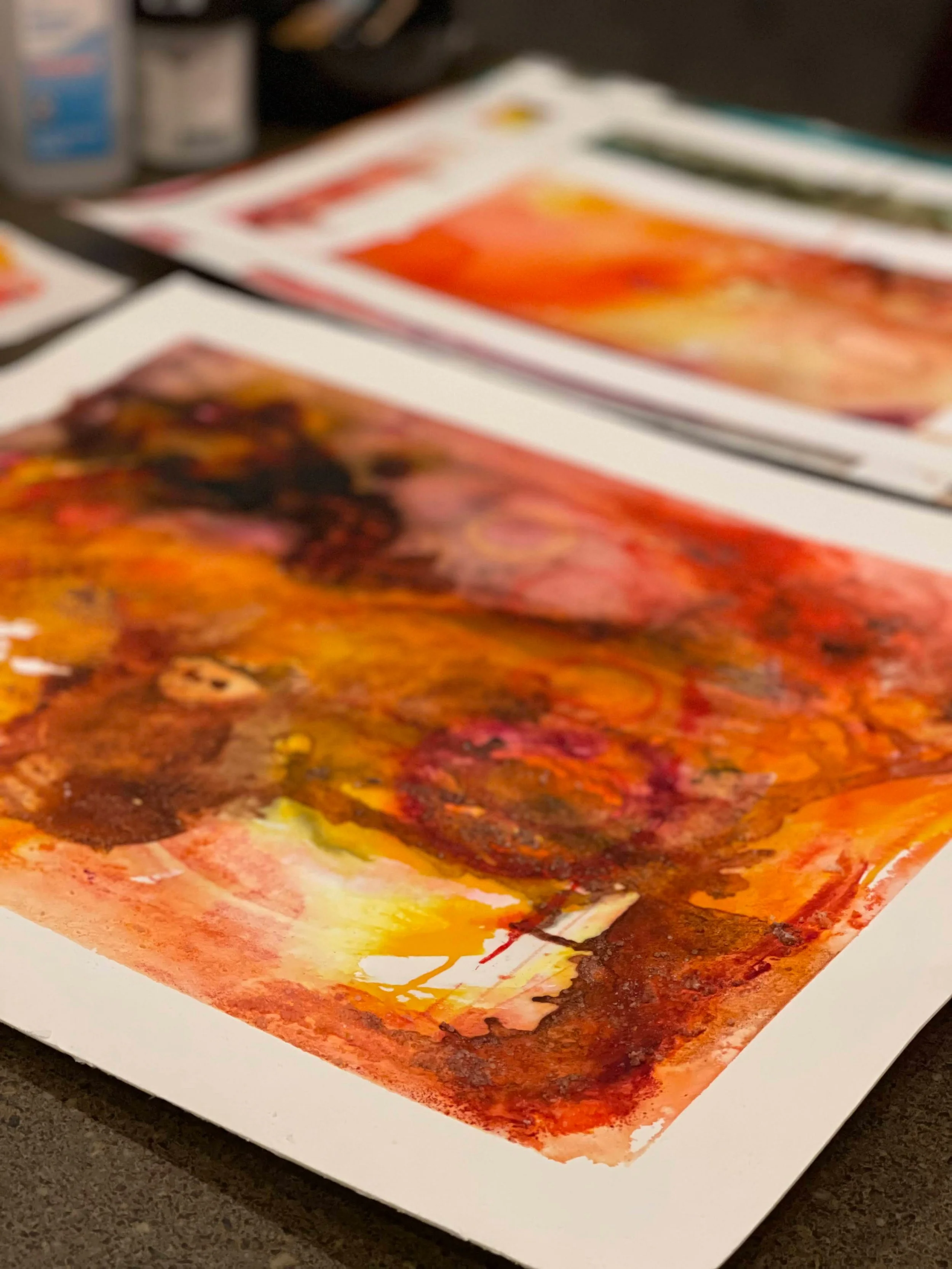 Close-up of abstract watercolor paintings with vibrant red, orange, yellow, and black hues on paper.