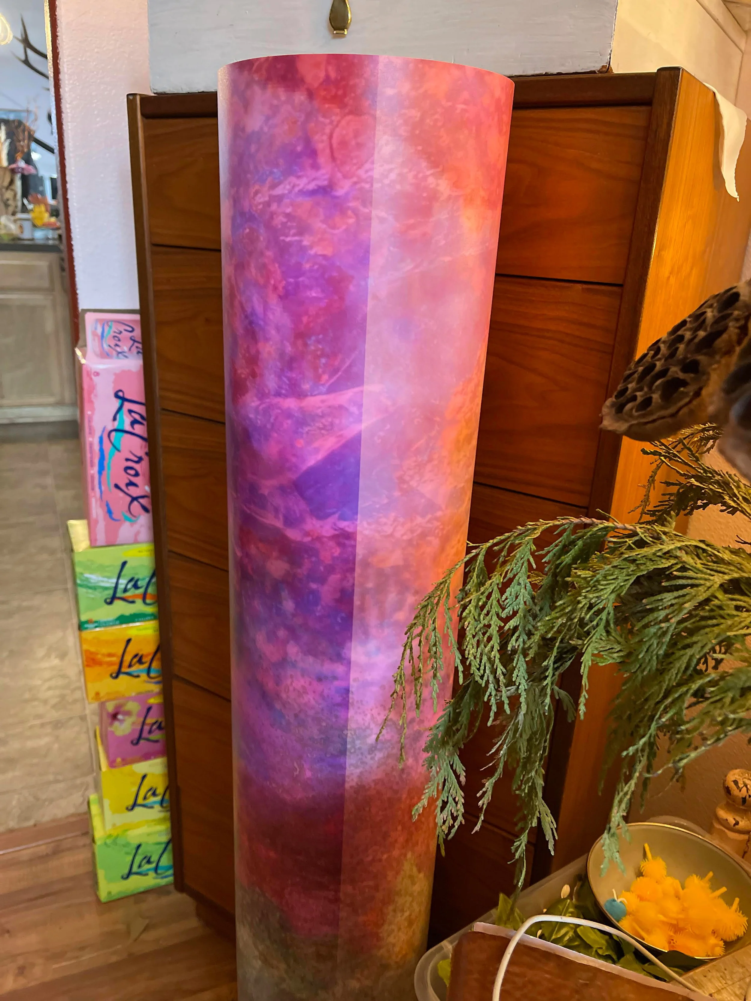A wooden storage cabinet with multiple labeled drawers, topped with potted plants, in front of a colorful wall art mural featuring a woman’s face and pink, orange, and yellow text. There are decorative items, a lamp, and shelves in the background. View fullsize