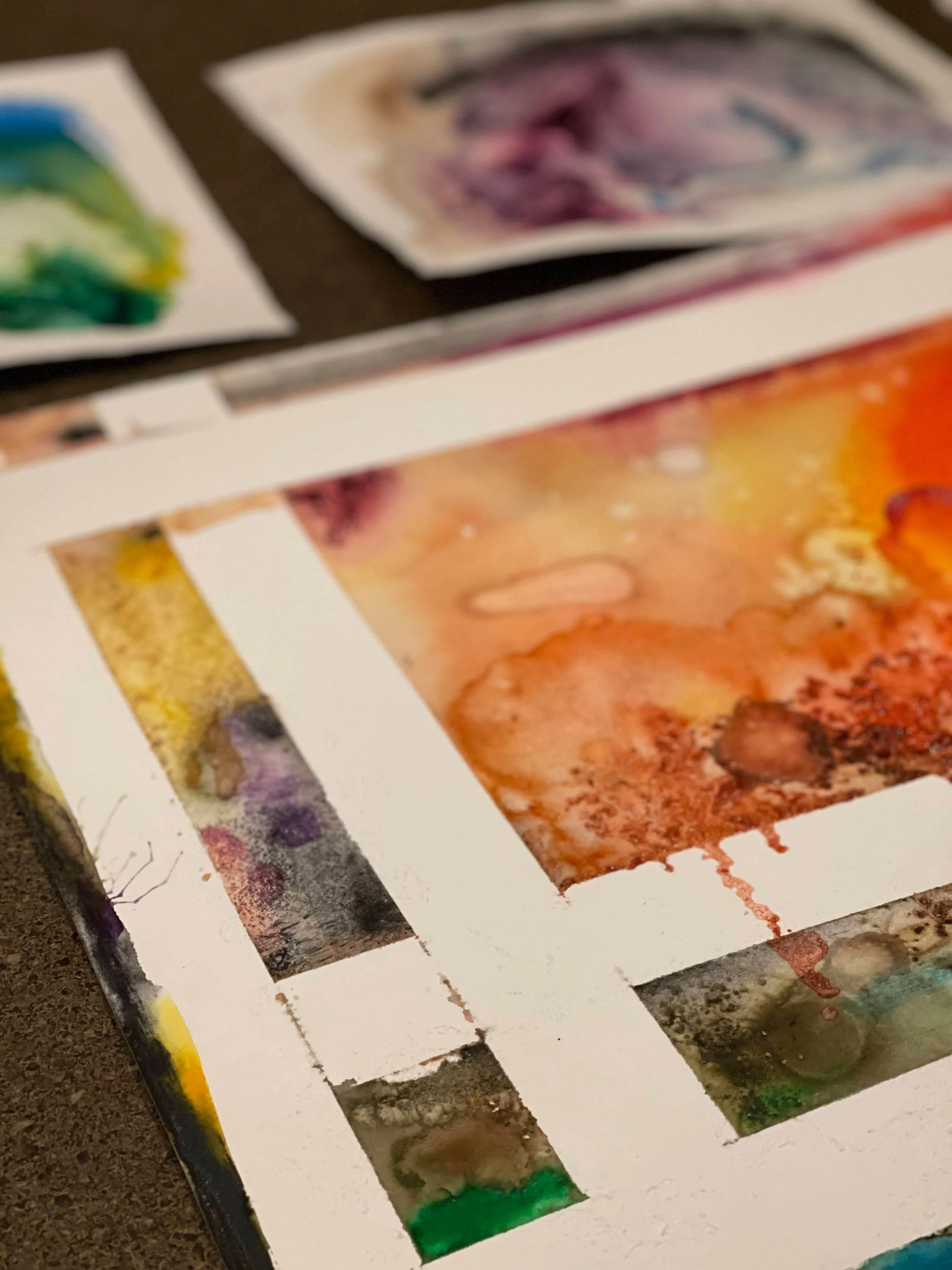 Close-up of a watercolor art sheet with colorful abstract paintings and cutout sections on a dark table.