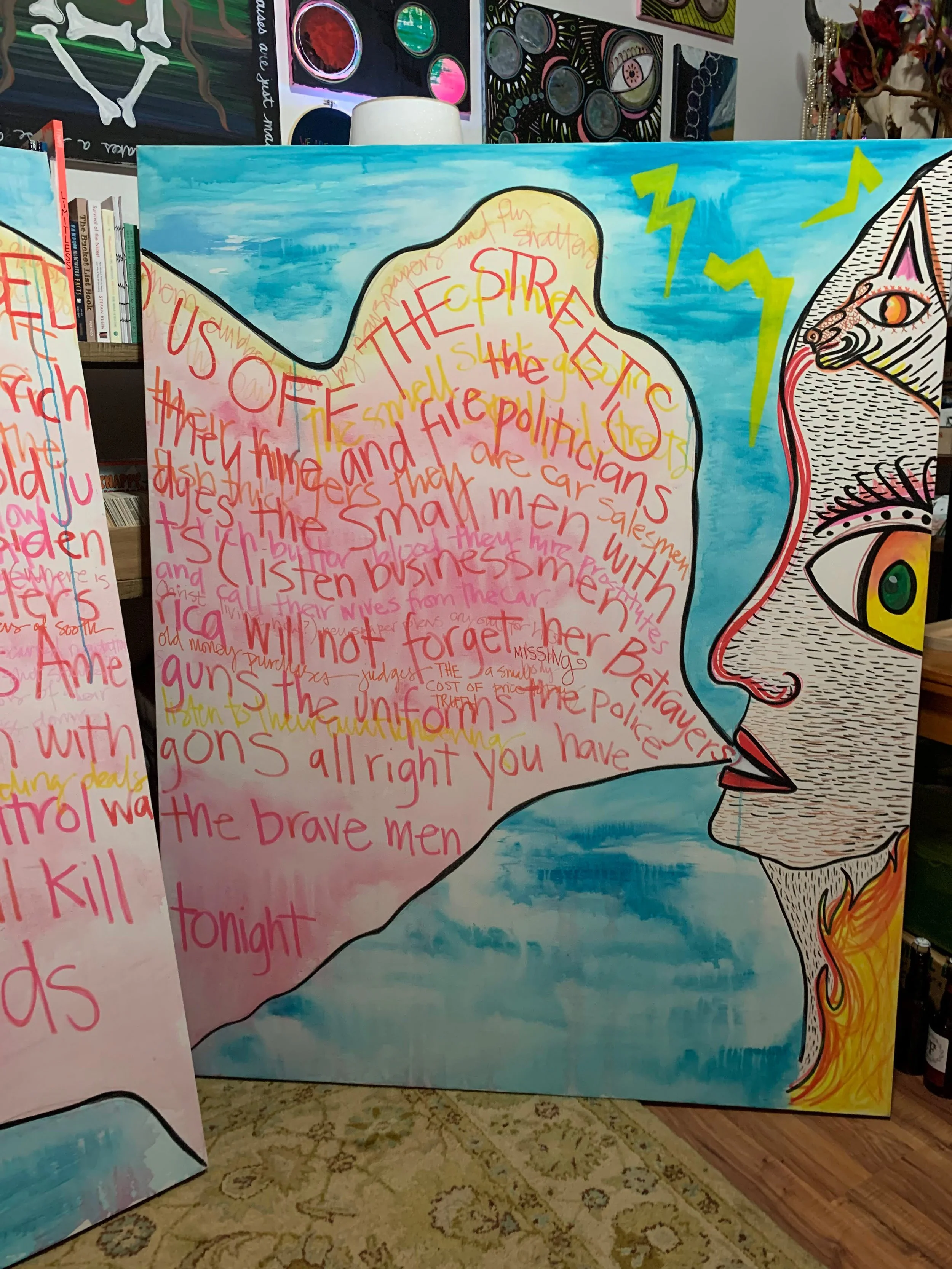Two large artworks with colorful text and illustrations of women's faces in an art gallery or studio. The left artwork features a woman with a flower in her hair and a speech bubble with red text. The right artwork illustrates a woman with bold makeu View fullsize